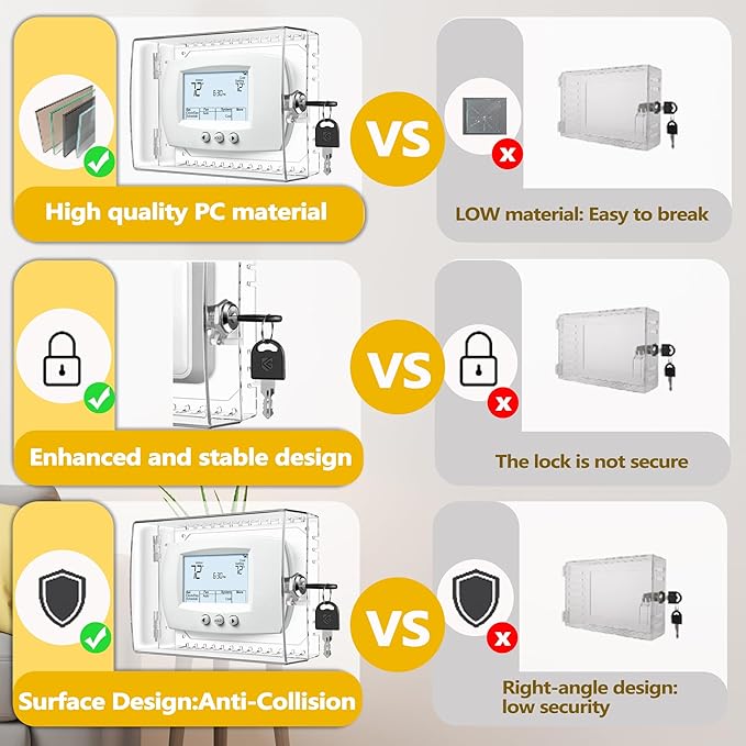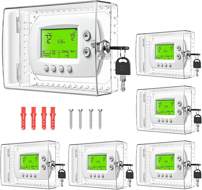 - 【Tamper-Resistant Design】The thermostat lock box is engineered to deter tampering attempts with its sturdy construction and secure locking mechanism. The thermostat cover with lock prevent unauthorized adjustments, tampering to thermostat settings by children, tenants, or the public