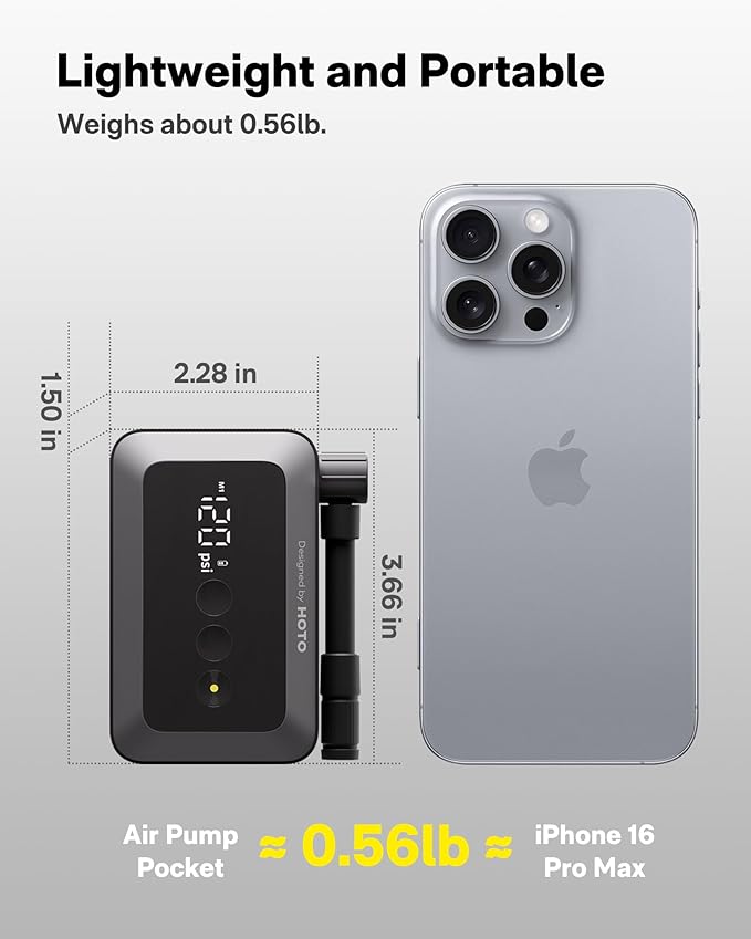 - POCKET-SIZED BUT POWERFUL: Measuring just 3.66 x 2.28 x 1.5 in and weighing 0.56 lb, the HOTO bicycle pump is incredibly lightweight and portable. It's perfect for cyclists and outdoor enthusiasts to carry on their adventures. Built-in 2000 mAh high-capacity lithium batteries and a brushless motor, it can inflate eight flat tires or eighteen low-pressure tires after fully charged