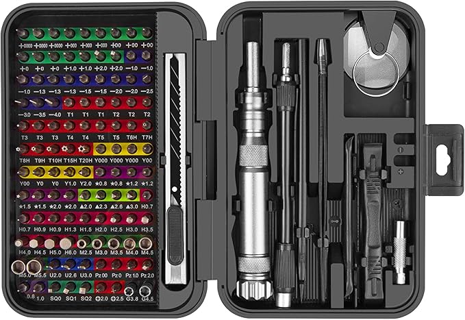 - 132-in-1 Multifunctional Precision Screwdriver Set: This extensive toolkit includes 108 precision screwdriver bits along with 24 additional tools like a magnetic extension rod, tweezers, and a suction cup. It's designed to handle a variety of repair tasks, from electronics like smartphones and laptops to household appliances, watches, and eyeglasses, offering a complete solution for all your repair needs.