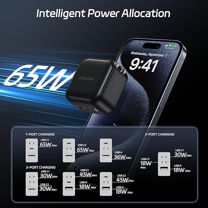 - Multi-Ports Universal Charger Adapter: Power is effectively distributed among the three ports, charge 3 devices at the same time. LULULOOK USB C Fast Charger Brick has three ports together Max 66W output (USB-C 1 30W, USB C 2 18W USB-A 18W), 3 ports single output (USB-C 1 65W Max, USB-C 2 65W Max, USB-A 36W Max), and 2 ports output (USB-C 1 30W Max + USB-C 2 30W Max, USB-C 1 45W Max + USB-A 18W Max, USB-C 2 45W Max + USB-A 18W Max);