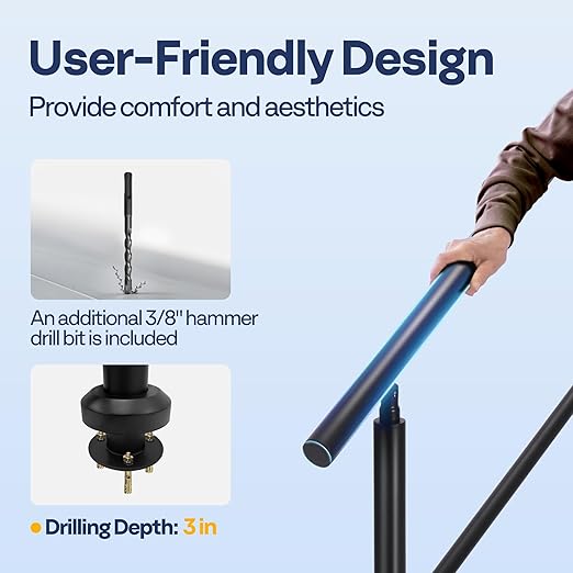 - ππππ ππππππππππππ: The VIVOHOME 4 Step Hand Rails come with all the necessary hardware for quick and easy installation; You can easily attach them to wooden, concrete, or brick steps with just basic tools; The pre-drilled holes in the base of stair railings make the installation process even faster and more straightforward; An additional 3/8" hammer drill bit is included, allowing for installation on more solid surfaces; Recommended drilling depth: 3 in