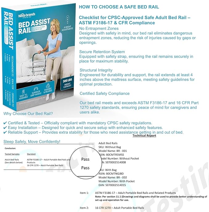 NEDA Adjustable Bed Rails for Elderly Adults – Medical Bed Assist Handle, Safety Support Rail for Seniors, Bedside Rail for All Bed Sizes ASTM F3186-17 & 16 CFR 1270 CPSC Certified