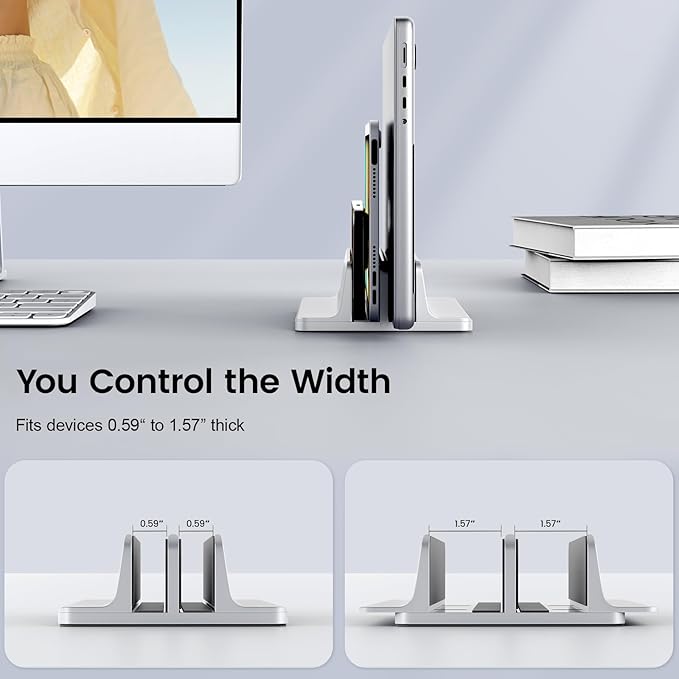 - Adjustable for Any Device: This vertical laptop stand for desk adjusts up to 1.57" wide to fit laptops, tablets, or cases. Comes with a tool for easy setup. A flexible laptop stand vertical for all your tech