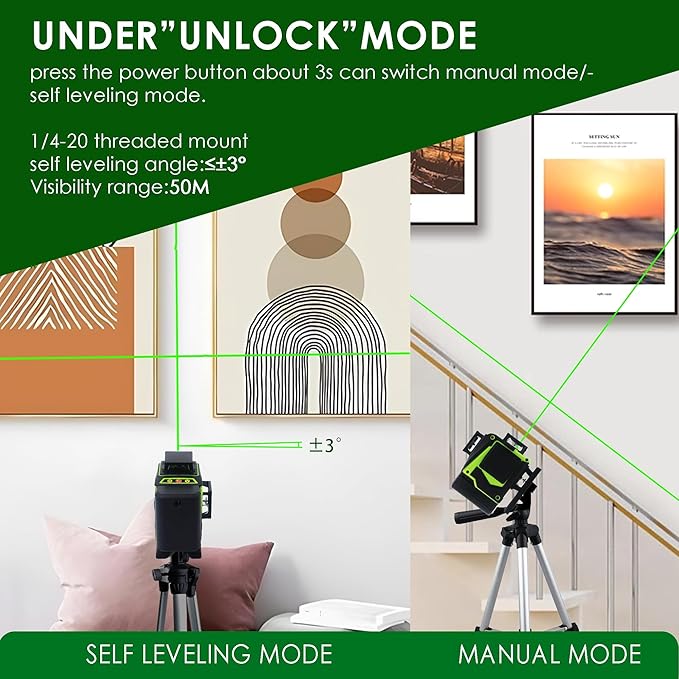 - 【Self-leveling and Manual Mode】Self-leveling Mode: Release the pendulum and the self-leveling laser level will automatically level within ±4°. If the leveling range is exceeded, the laser will flash to remind you. Manual Mode: To switch to manual mode, press and hold the center button for 3 seconds. This allows you to project the laser line at any angle, providing maximum flexibility for customized alignment needs.
