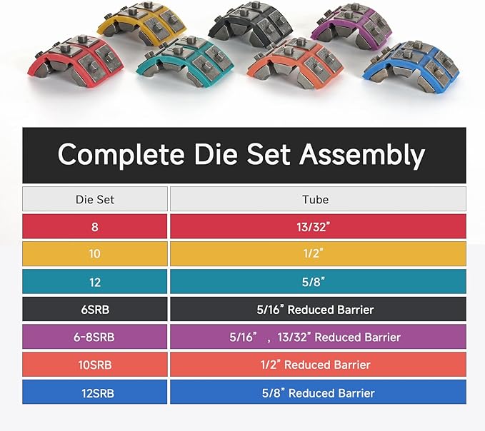 - Complete Die Set: The kit comes with a complete set of dies covering hose sizes, #8(13/32"), #10(1/2"), #12(5/8"), #6SRB(5/16"), #8SRB(13/32"), #10SRB(1/2"), #12SRB(5/8"), with quick snap-in dies requiring no pins or screws