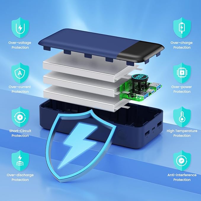 - 【Safe and Secure Portable Bank Charger】The portable phone charger built in quality batteries and comprehensive multi-protect safety system, include Over-voltage Protection, Over-current Protection,Short-Circuit Protection,Over-discharge Protection, Over-charge Protection,Over-power Protection,High Temperature Protection, Anti-interference Protection,and more. Ensure safety when you using the charging banks. The power bank measures 6.02 x 2.87 x 1.61 inches and weighs 1.38lb, featuring a large-capacity design.