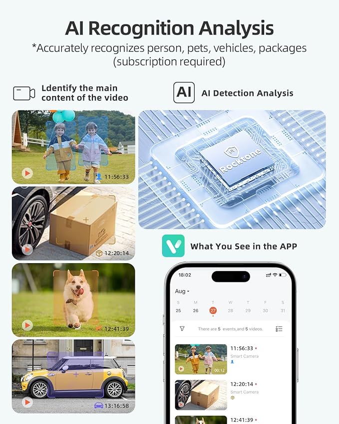 - PIR Motion Detection & AI Analysis Recognition - Rocktone wireless security cameras feature advanced PIR motion detection technology, which triggers instant alerts to your phone via the "Vicohome" app when motion is detected. With its cutting-edge AI analysis, the system can accurately distinguish between people, vehicles, pets, and packages, recognition accuracy rate is as high as 95%