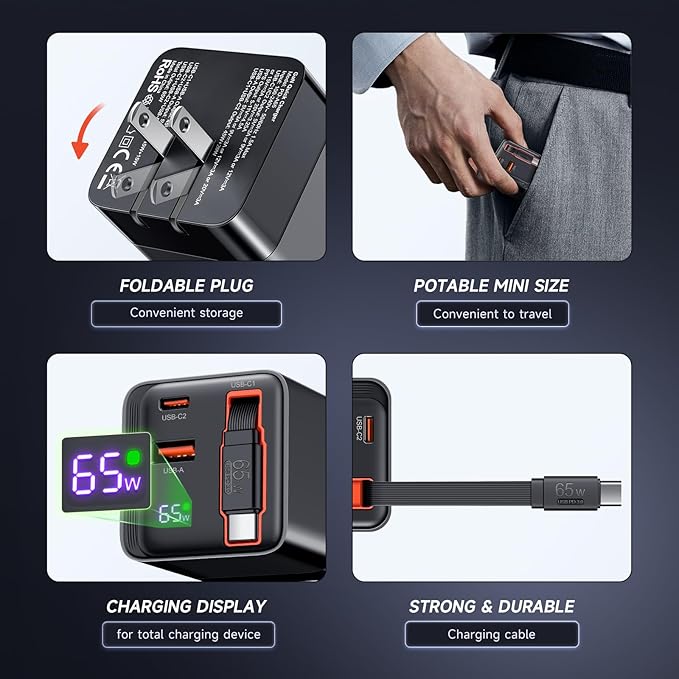 - Special Feature : 65w USB C Charger Building in USB C Cable, Foldable plug, LCD display, Multi Device Charging, Travel