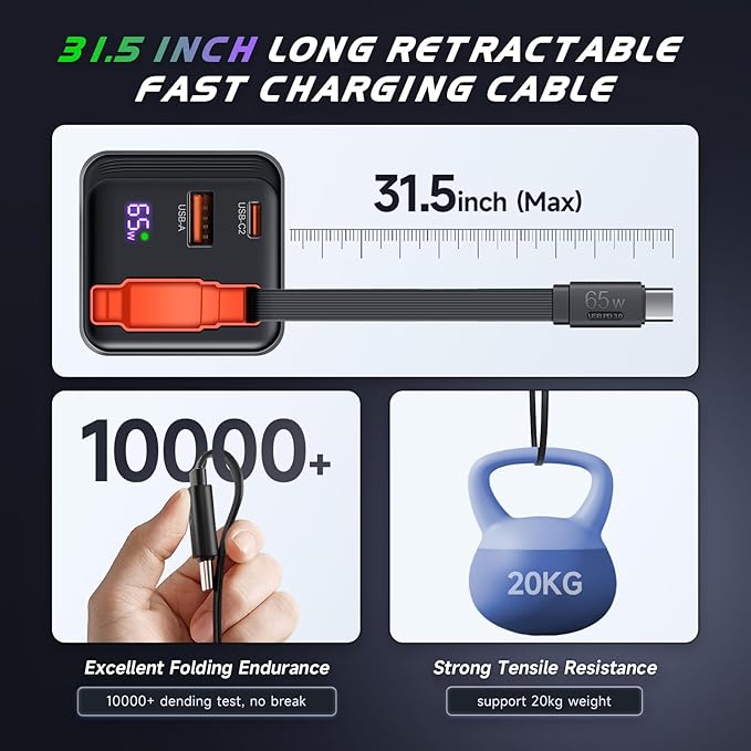 - New Design USB C Charger Block with Retractable Type C Charging Cable : Comes with a built-in convenient 31.5 inch retractable fast-charging cable, ensuring you always have the perfect length and neatly retracts for easy storage and portability.