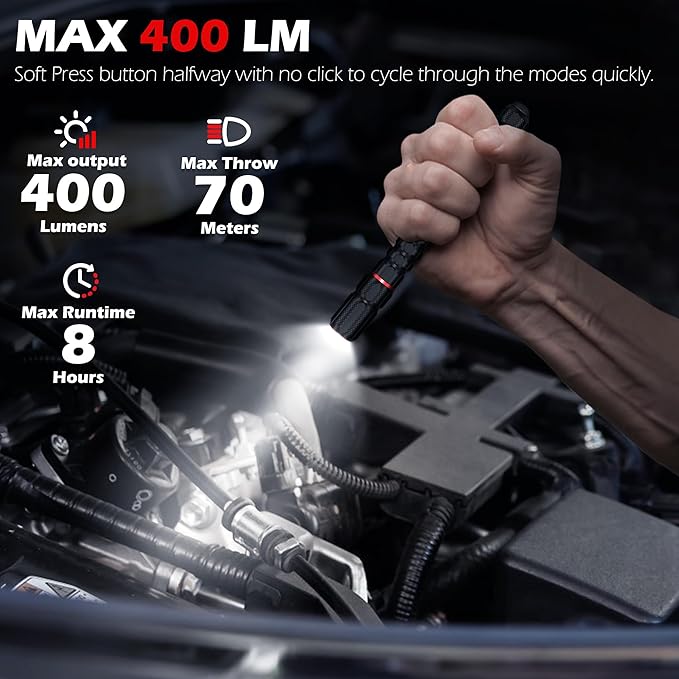 - 【High Brightness & Long Runtime】 Delivering 400 lumens in high mode, the pocket flashlight illuminates up to 70 meters. The low mode provides up to 8 hours of continuous use, making it ideal for extended tasks or use in low-light environments. Whether for professional use or outdoor activities, FORTO penlight offers the perfect balance of brightness and runtime.