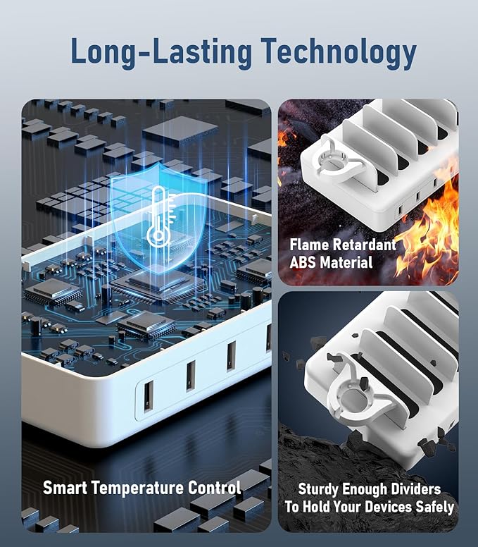 - 【Intelligent Device Protection】Our charging station for multiple devices apple has real-time temperature monitoring technology. It automatically cuts off the power supply when the temperature is too high to prevent short circuit.This apple charging station also has overheating and overcharging protection to maximize protection