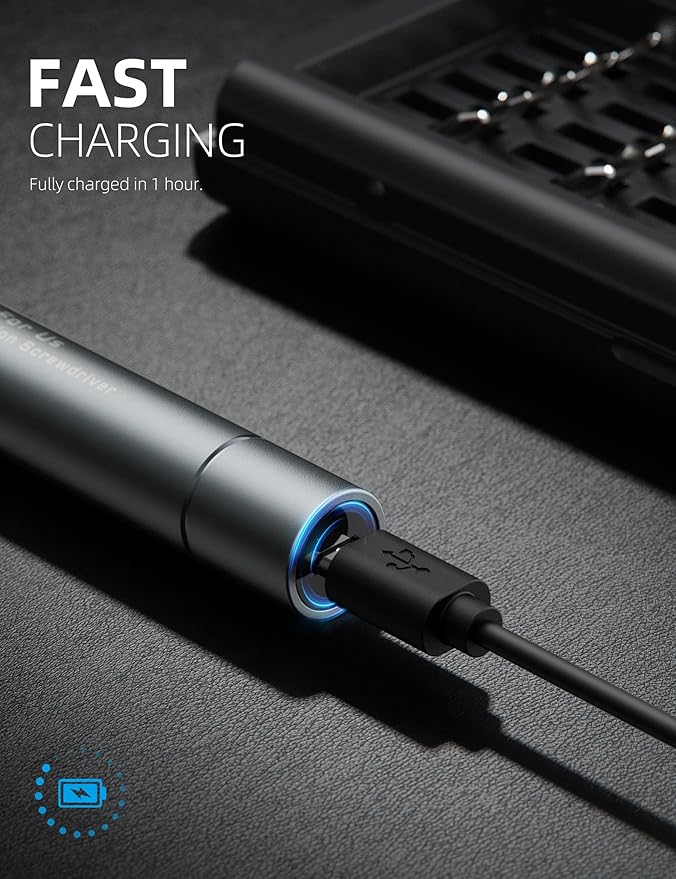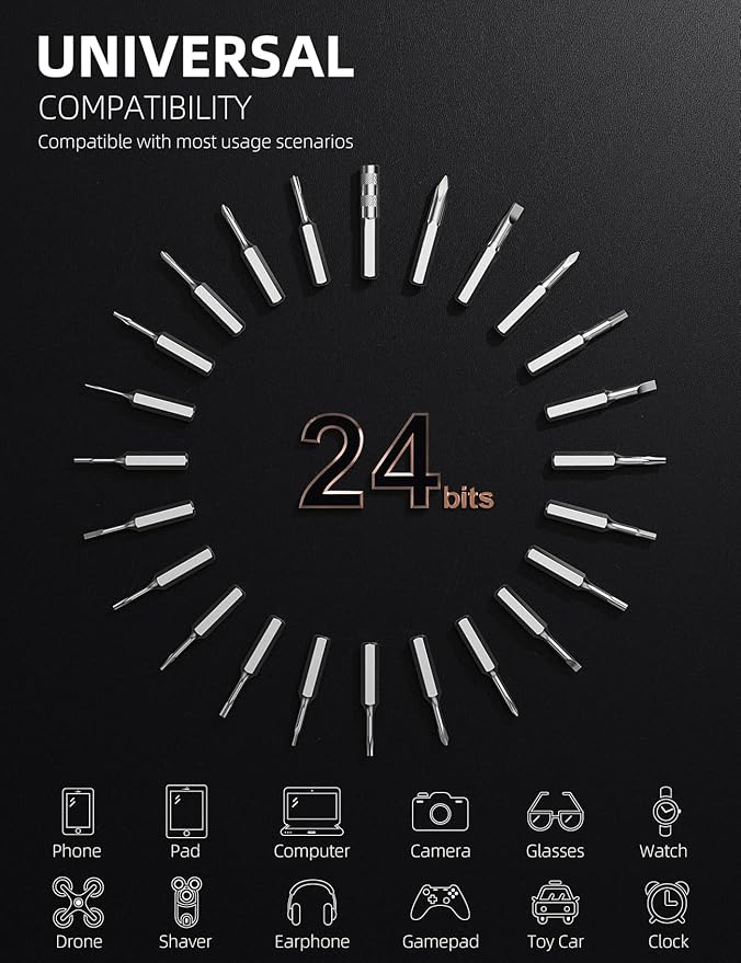 - Precision Screwdriver Set with 24 bits:This mini screwdriver set includes 24 high-quality self-magnetic bits made from durable S2 hardened steel. It comes with a Mini Electric Screwdriver, Clip Storage Case, Micro USB Charging Cable, and User Manual, offering everything you need for various repair projects.
