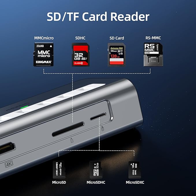 - High-Speed Data Transfer : usb c hub multiport adapter comes with 2 USB 3.0 and USB C 3.0 ports (not for video outpu) up to 5Gbp/s,transfer speed for quick data transfer , 2 USB A 2.0 ports up to 480mbp/s,your can connect usb keyboard, mouse, usb driver, usb hard disks to your laptop easily via this macbook usb adapter. Built-in SD / TF/MS card slots, capable of reading memory cards with a maximum capacity of 1TB