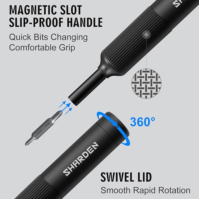 - ERGONOMIC DESIGN: The small screwdriver features a anti-slip handle for comfortable operation, the magnetic tip holds bits stable and the 360°rotating cap provides smoothly spin for time saving