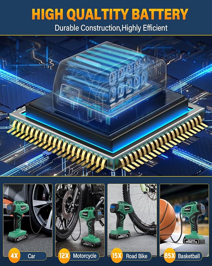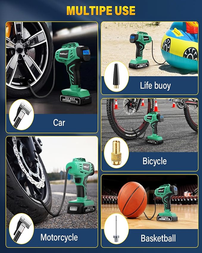 - Dual Power Supply Car Tire Inflator:The portable tire compressor features with high-capacity 20V rechargeable Li-ion battery and 12V DC car adapter,make the inflation more easily.In case the battery runs out, the air tire pump comes with a 13.1 Ft DC 12V power cord that enables you to power it by connecting it to your car. No need to worry about it running out of battery during the trip