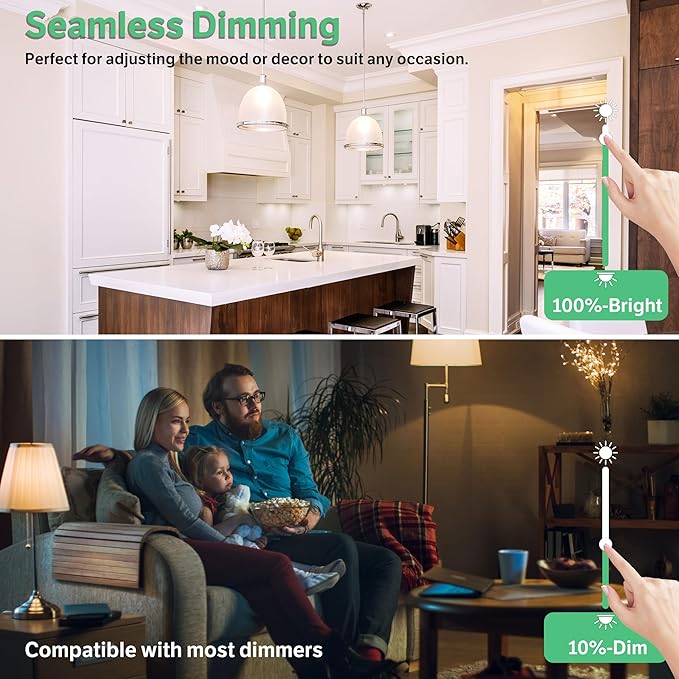 - Energy Efficiency and Cost Savings: Our LED light bulbs provide a significant improvement in energy efficiency compared to traditional incandescent bulbs, using only 9.5W to replace a 60W incandescent bulb equivalent, resulting in an 85% reduction in energy consumption and substantial savings on electricity bills. These bulbs are fully dimmable, allowing you to adjust the brightness from 10% to 100%. This feature enables you to create the perfect ambiance for any occasion .
