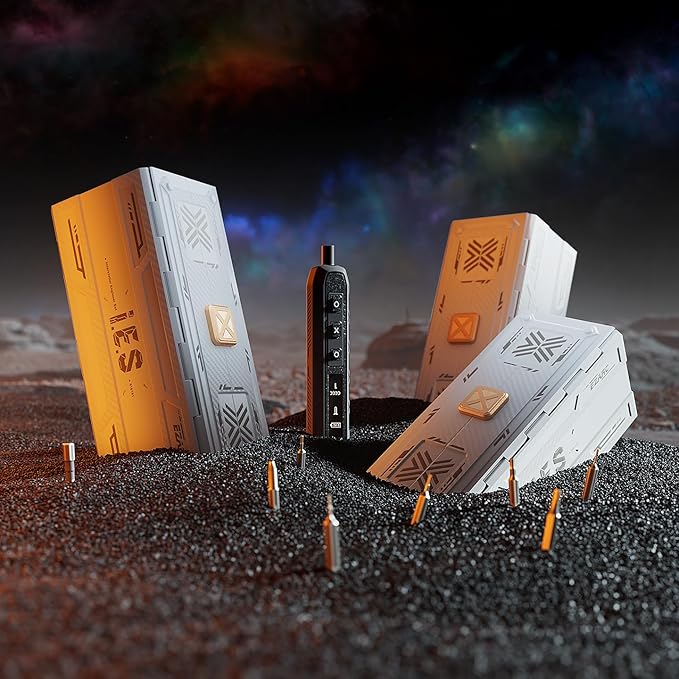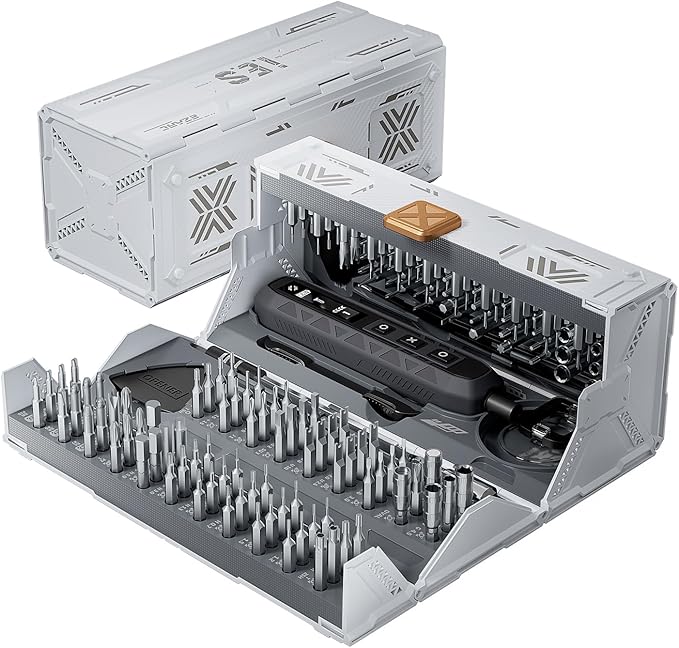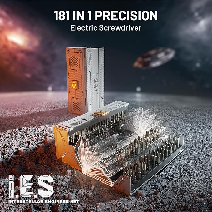 - 【Electric Precision Screwdriver Kit】With inspired by space stations, this electric screwdriver set offers a unique flip-cover for a sense of ceremony. Inside, the neatly arranged magnetic screw bits and versatile tools make it perfect for both daily precision maintenance and complex repairs.
