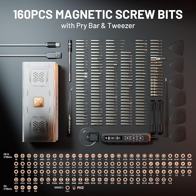 - 【Perfect for Families and DIY Enthusiasts】With 160 precision bits in 26 types (PH1, PH2; H3, H4, H5, H6; SL4, SL5; TR20, TR25, and more), this electric screwdriver kit meets every household need, covering all possible screw sizes and types. Thus, it's the perfect gift for families or DIY enthusiasts with its innovative features and stylish futuristic aesthetics.