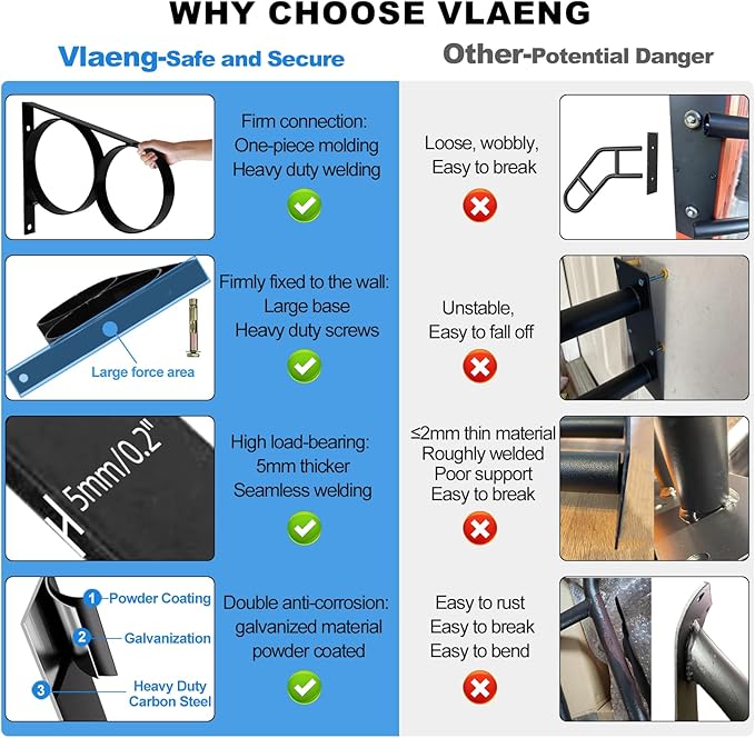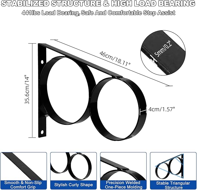 - ANTI-CORROSION & HIGH-QUALITY--The outdoor stair hand rail is made of black powder-coated heavy-duty solid carbon steel, which is resistant to scratches, cracking, peeling, UV rays, and rust, ensures long-lasting performance even in harsh weather. Thicker 5mm/0.2" anti-fracture materials, Tight welds, stabilizing triangular structures, and galvanized heavy-duty precision screws make it can hold up to 441lb large load capacity. More stable than other wall-mounted handrails.