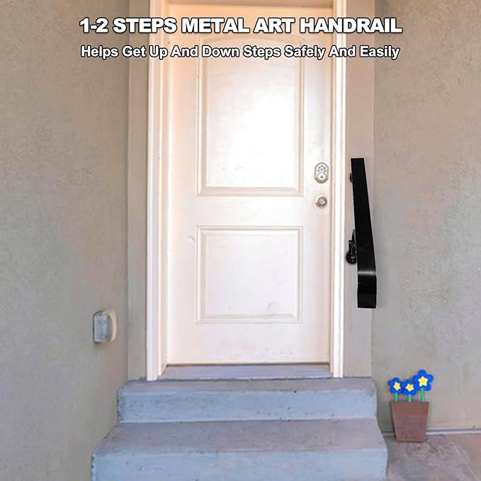 - SAFE HANDRAIL FIT FOR 1-2 STEPS--Product Size: 21.65x17.6x12.4"(LxWxH), porch hand railing offers 55cm/21.65" gripping length, covers 44.5cm/17.6" steps width. Designed for 1-2 steps. The hand rails for outdoor steps serve as a support to help people get up and down the steps easily and safely, and keep balance during inclement weather such as rain or winter, effectively preventing slips and falls. When the neighbors are using the regular style, then this artistic style will make your house stand out!