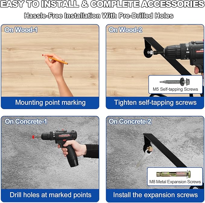 - EASY TO INSTALL & MAINTAIN--You can easily install single-step handrail to wood posts with 2 self-tapping screws or concrete walls with 2 expansion screws pre-drilled holes. First, choose your desired location for the wrought iron handrail and mark it. Then, drill 3mm size 16mm deep holes on hardwood(No drilling of cork) or 5mm size 20mm deep holes on concrete. Finally set up the handrail with the screws. You only need to use a rag to easily remove the dust on the outdoor metal hand rail.