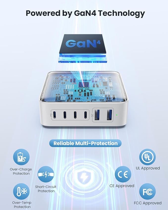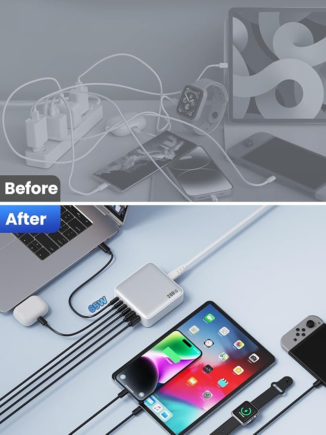 - 【6-in-1 USB C Charger Block】Our USB charger provides multi charging options to meet your different needs .With 4 USB-C ports and 2 USB-A ports, no need for more adapters. You’re ready to charge 6 devices simultaneously. Such a usb c multiport charger can handle all your devices at fast speed with a total output up to 200W.