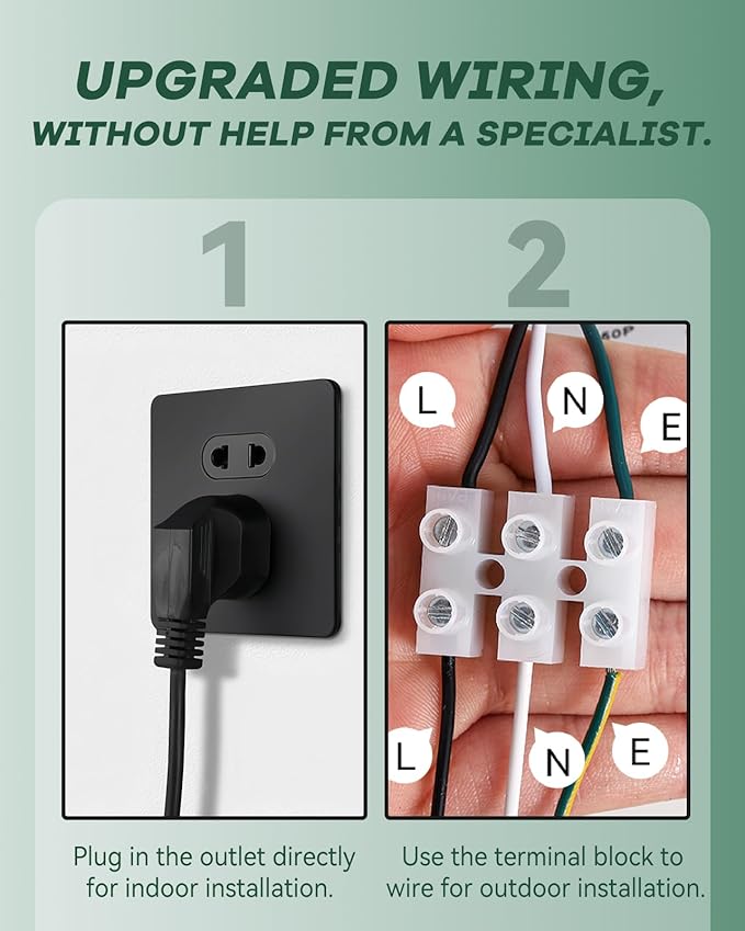 - Upgraded Wiring--Easy Installation in 2 ways: you can plug in the outlet directly for indoor installation or use the terminal block to wire for outdoor installation, without help from a specialist.