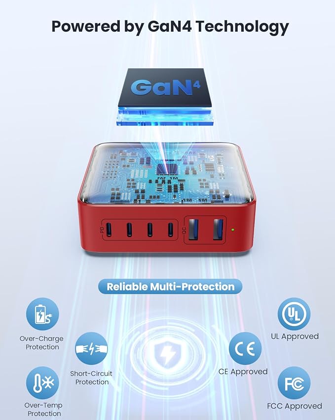 USB C Charger Block 200W,Upgraded GaN IV 6-Port USB C Charger, Fast Charging Station Hub, PD 65W Laptop Adapter Compatible with DELL HP MacBook Pro/Air/iPad, iPhone 16/15/14, Galaxy S24 etc-Red