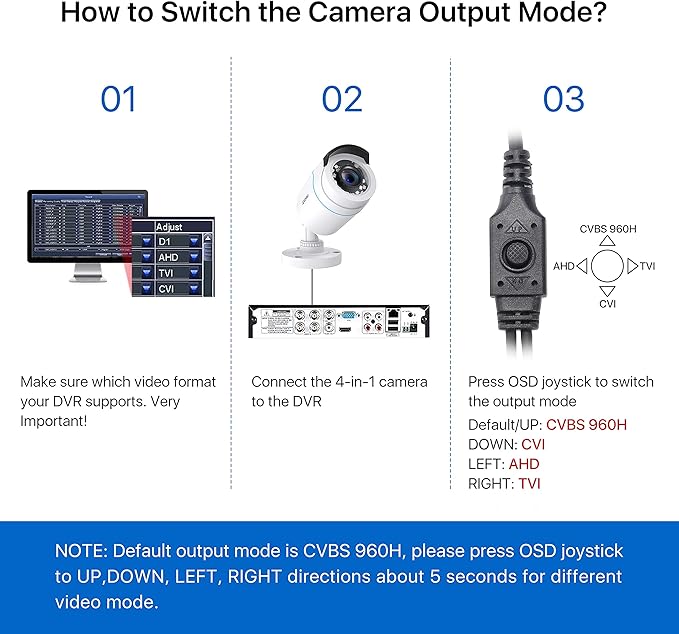 - (3). [ Compatibility ] __ This is TVI camera, please connect it with a compatible HD TVI or other hybrid recorder to fortify your home security.