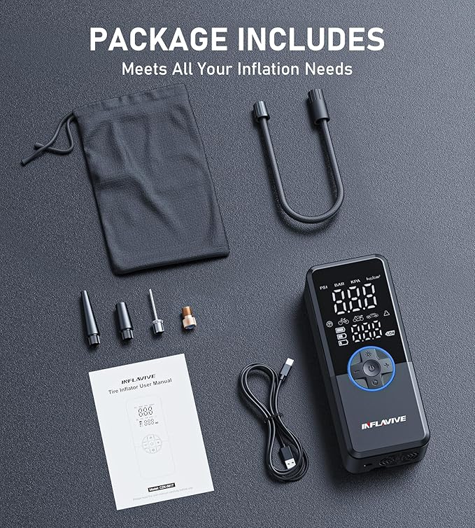 - 5 Personalized Modes: This air pump features five inflation modes(car, motorcycle, bicycle, ball, and custom). You can also easily choose between 4 pressure units as needed (PSI, Bar, kPa, kg/cm²). The customizable mode lets you set precise pressure levels for any task