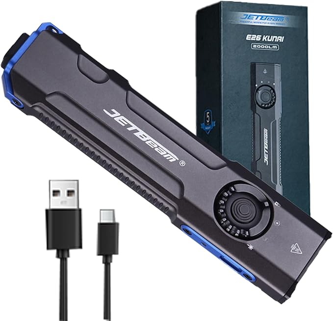 - 【Triple Light Sources Pocket Lights 】 JETBeam E26 combines 1800 lumens white light,365 nm UV light,green beam in a single flashlight,Triple Light Sources Pocket Lights offering versatility for a wide range of applications,Whether it's for home, work, or outdoors.Easily switch between the three lighting modes using the intuitive circular selector