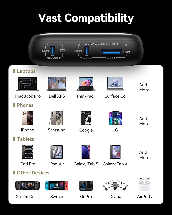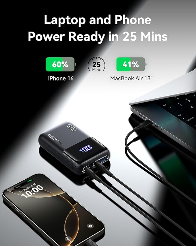 - Power Ready iPhone & MacBook in 25Mins: A must-have for multi-device users, this power bank provides up to 65W high-speed charging for two devices simultaneously. In just 25 minutes, it can charge your MacBook Air 13" to 41% and iPhone 15 to 56%. It also supports Samsung Super Fast Charging 2.1.