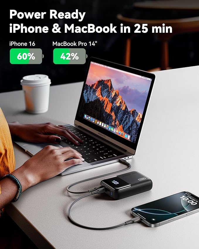 - Power Ready iPhone & MacBook in 25Mins: A must-have for multi-device users, this power bank provides up to 110W high-speed charging for 2 devices at once. In just 25 minutes, it can charge your MacBook Pro 14" to 42% and iPhone 15 to 62%.