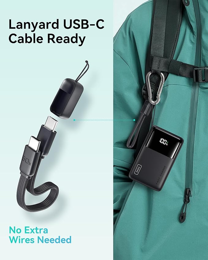 - Lanyard USB-C Cable Ready: Equipped with INIU's exclusive nylon braided USB-C to C lanyard, this cable is far more durable than plastic alternatives. Never worry about forgetting your charging cable again—charge and recharge with just one convenient cable.