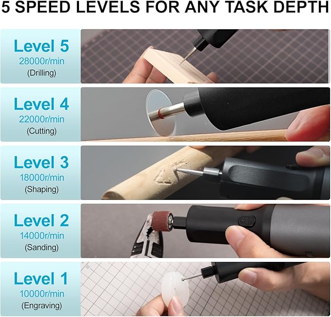 - 【Custom Power for Every Project】: Empower your creativity with a 7.2V higher-torque motor and 5 adjustable speed settings (10000-28000 RPM), this rotary tool offers more powerful and precise control to meet the demands of various tasks, making it suitable for both beginners and experts.