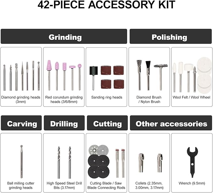 - 【High-Precision Stability for Every Project】: The EP2 electric rotary tool features advanced rotary bearings and a precision spindle lock, with 42 premium accessories included. Perfect for carving, sanding, polishing, and cutting, it's ideal for DIY projects and detailed craftsmanship.
