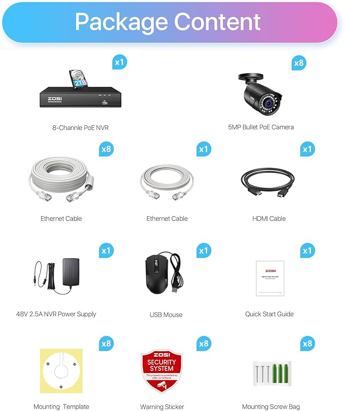 - (5). [ Plug and Play 16CH Expandable 2TB PoE System] __ Truly plug and play, making it easier for beginners. Just connect the PoE IP camera to NVR with an Ethernet cable for both data & power transmission, more stable and reliable than a wireless system. With an optional PoE switch (not included), this 8 Ports NVR can be expanded up to 16 channels, supporting a maximum of 16 PoE cameras, providing you with the flexibility to add additional ZOSI PoE cameras for your home or growing business.