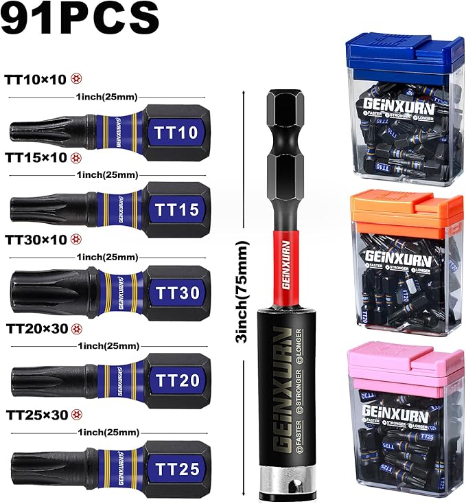- Security Torx Screwdriver Bit Set: 1 inches (TT10x10,TT15x10,TT20x30,TT25x30,TT30x10) 90 pieces driver bits and 1 Pieces 3 inches impact bit holder, they're all have a customized box