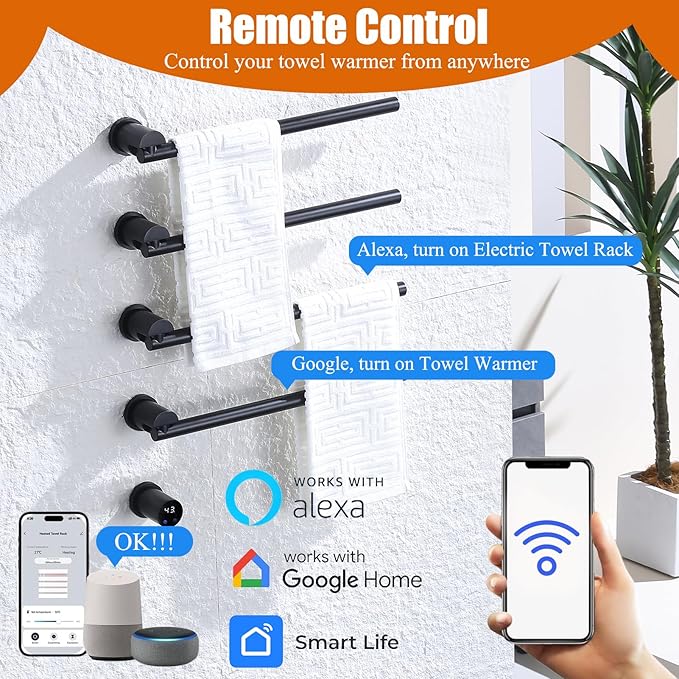 - [Control at Your Fingertips] Through smart APP, Alexa or Google Home, you can control the temperature, set timers, and maintain the perfect warmth for your towels from anywhere, anytime. Easily control your towel rack settings remotely, personalizing your comfort and convenience like never before.