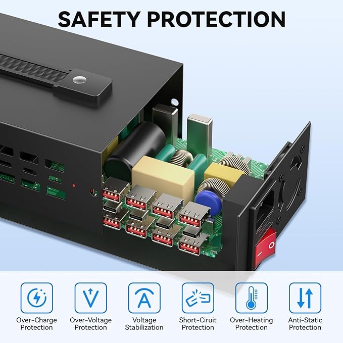 - SAFE AND SECURE CHARGER - The charging station for multiple devices has a built-in smart chip to prevent overvoltage, overcurrent, overload and short-circuit. Fan cooling can effectively dissipate heat and prevent overheating. MultiProtect safety system provide 100% comprehensive protection for you and your devices.
