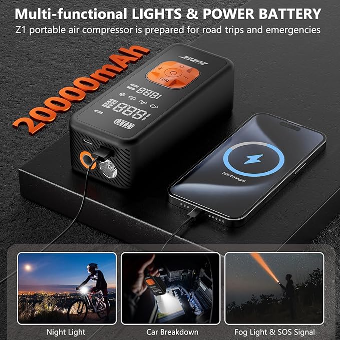 - [Thoughtful emergency tool] - This cordless tire inflator can be an emergency tool. In the dark, the multi-function LED light can help you solve vehicle failures, alert pedestrians or send distress signals. It is also an emergency power source for electronic devices. ZUZEE is ready for your road trips and emergencies anytime, anywhere.