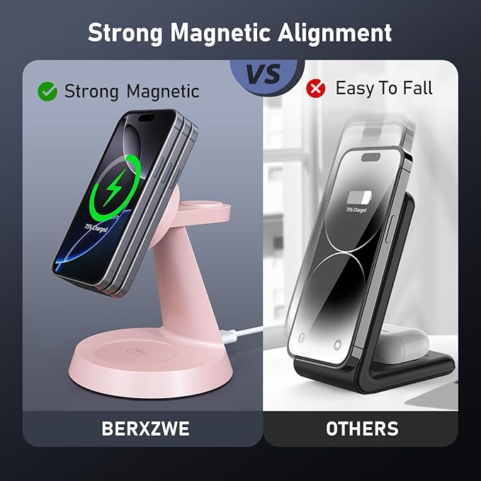 - 3 in 1 Magnetic Wireless Charger Station: BERXZWE 3 in 1 magnetic wireless charger station has newly upgraded magnetic suction. Efficiently wireless charging of iPhones, Apple Watches, and AirPods. The portable charging station means you no longer have to search for multiple chargers or deal with a cluttered desktop.Bring you a fast and stable magnetic wireless charging experience