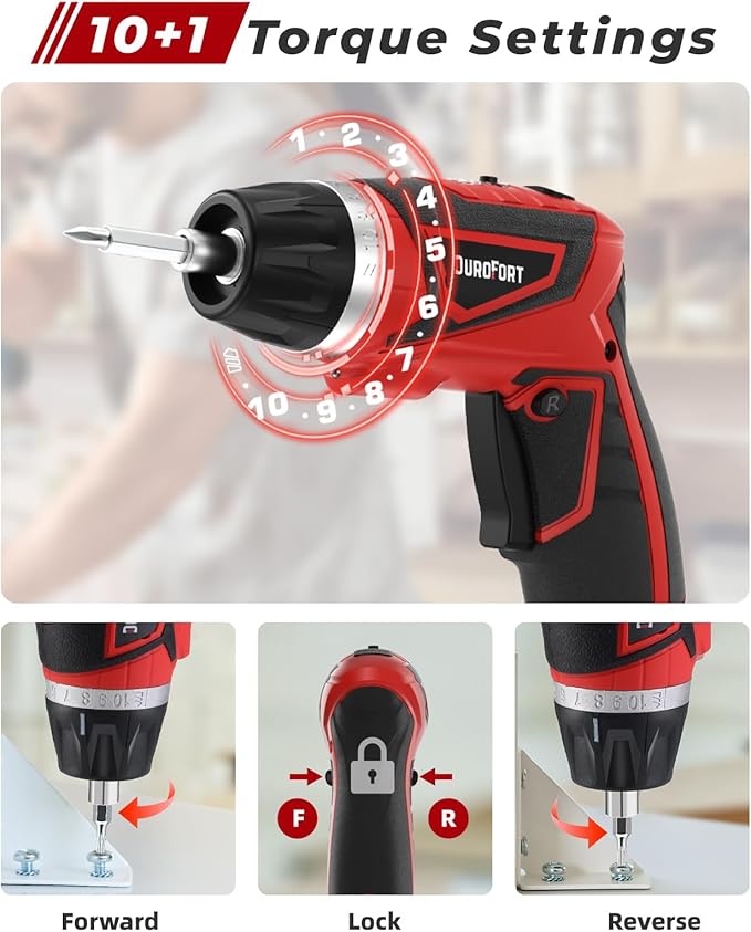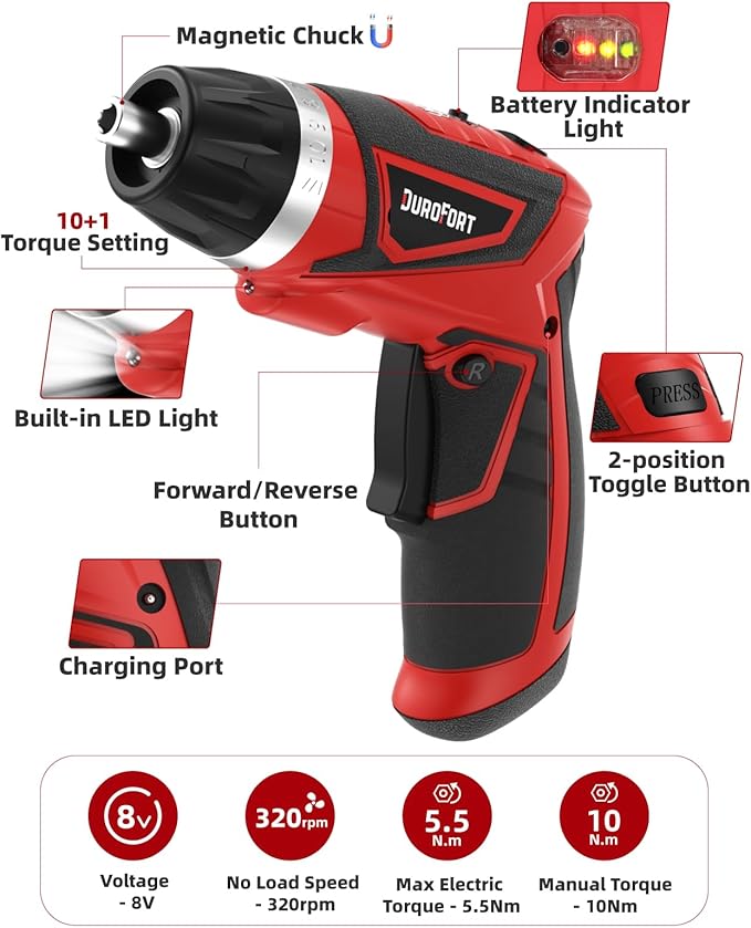 - The screwdriver is equipped with 8V voltage and built-in 2000 mAh Li-ion battery, providing powerful electric torque up to 5.5 Nm, manual torque up to 10 Nm, and speed up to 320 revolutions per minute, which makes it efficient for both home repairs and DIY projects.
