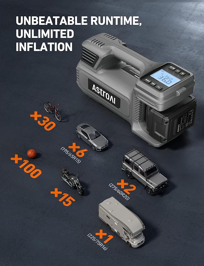 - Easy to Use & Long-Lasting Battery: Equipped with a 4AH battery, this offroad air compressor handle up to 9 car tires from 30 PSI to 40 PSI on a full charge. 45W quick charge and discharge with the included charger, eliminating reliance on fixed sockets. The cordless lithium battery gives you the freedom to inflate anywhere, whether in the garage, outdoors, or on camping trips. Even without a power source or no socket, this cordless tool ensures a long-lasting, convenient inflation experience.
