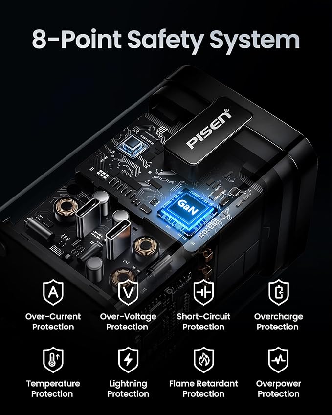- [Safety Protection System] PISEN Mag-Safe wireless charger is equipped with GaN technology, built-in multi-protection system. With higher energy efficiency and upgraded heat dissipation, GaN makes Mag-Safe phone stand safer without sacrificing a drop of power.