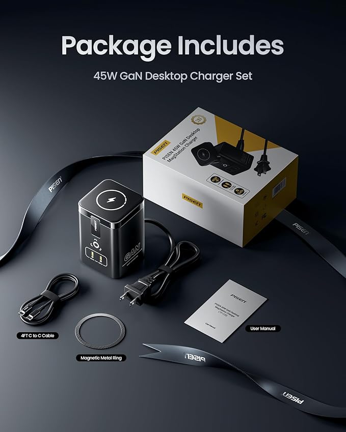 - [What's Included] PISEN 45W GaN wireless charger stand with AC plug, 4ft 60W USB-C to USB-C cable, magnetic metal ring, instruction manual.