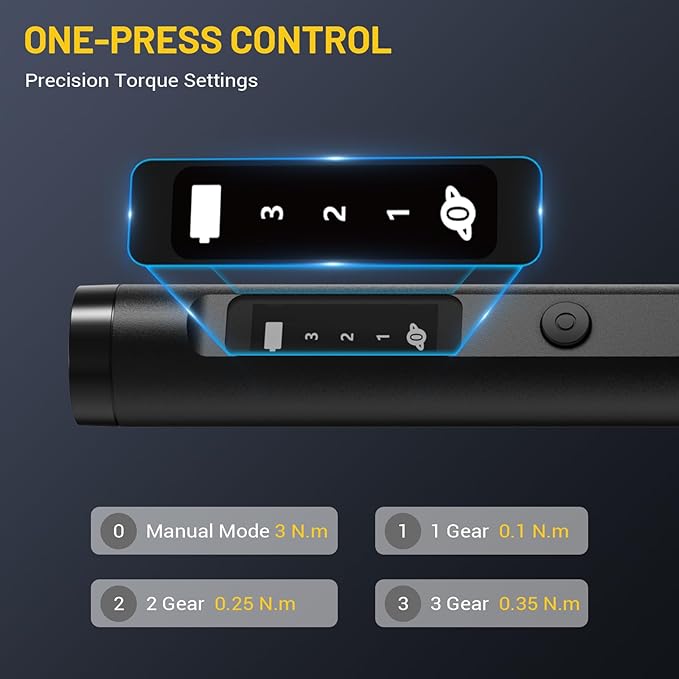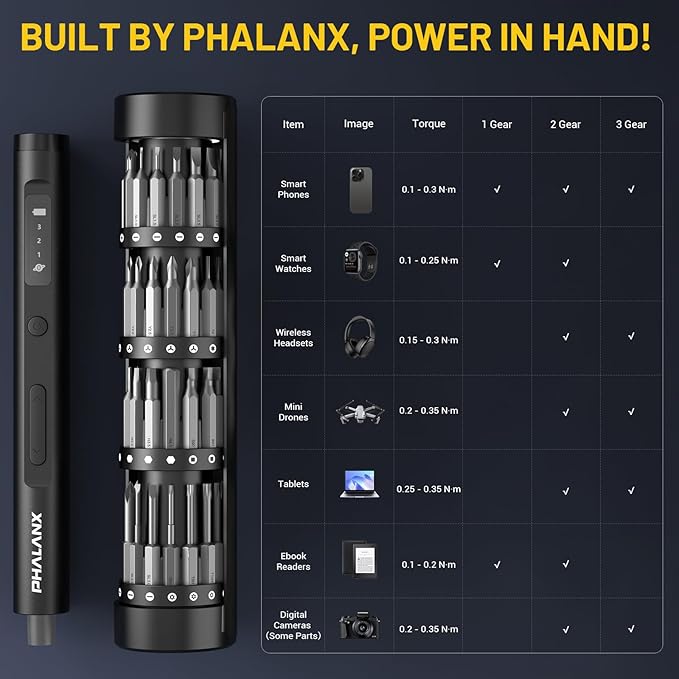 - ใ๐ฉ Expert Precision Torque for Delicate Tasksใ Exclusively designed for delicate electronics, this electric screwdriver provides three distinct electric torque settings: โ 0.1 N.m for ultra-fine work, โ 0.25 N.m for general tasks, and โ 0.35 N.m for secure fastening, plus a 3 N.m manual torque mode for higher torque needs and final tightening. An ideal watch screwdriver set and eyeglass screwdriver, itโs perfect for repairing smartphones, drones, laptops, and other tech gadgetsโ๐ก๏ธ preventing damage from excessive force.