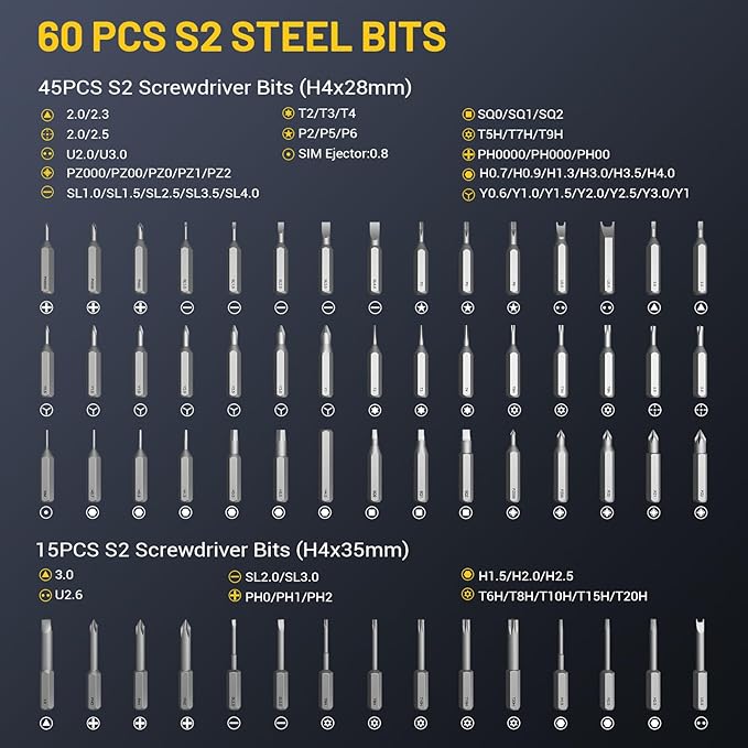 - ใ๐งฐ The Comprehensive 60-in-1 Bit Setใ This precision screwdriver set includes ๐ ๏ธ 60 S2 steel bits in 13 types, making it a complete screwdriver set for electronics and miniature devices. A great gift for men who love DIY, it โ ensures the perfect fit to avoid stripping and ๐ protect valuable gear.