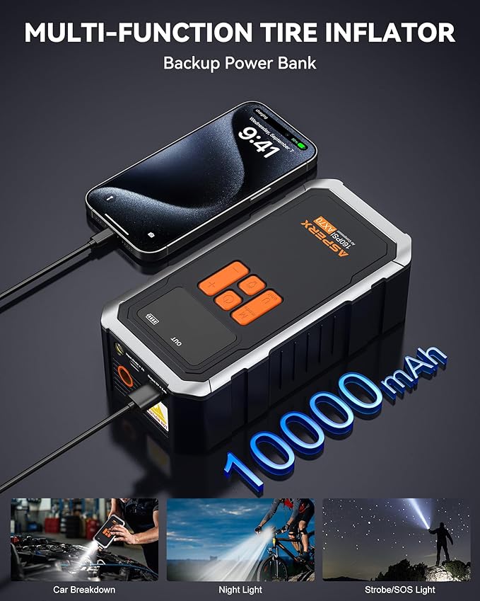 - 【Cordless Freedom & Carry Case】Say goodbye to messy cords! The rechargeable portable air pump runs 25+ minutes per charge – inflate 8-10 car tires or 15+ bike tires effortlessly. The AsperX Carrying Case is made out of an extremely tough material, exhibiting outstanding cut and tear resistance. Compact design fits in any trunk for emergency tire inflator for car readiness.