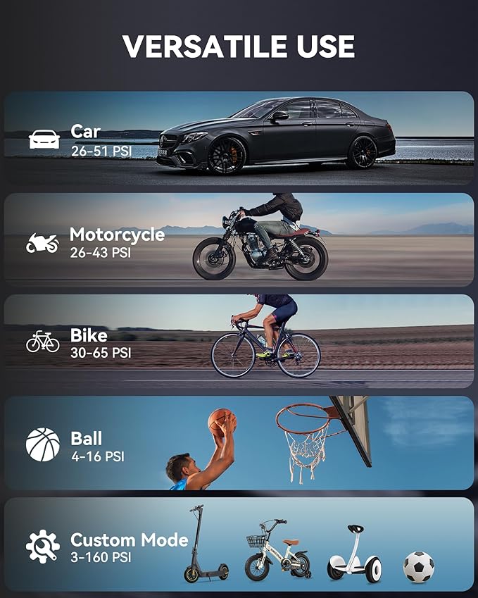 - 【4+N Smart Modes】Four preset modes (Car/Motorcycle/Bicycle/Ball) are convenient for beginners to choose. And the Custom mode (3-160psi), you can use the “+” and “-” control buttons on the tire inflator to easily select your desired pressure. One-click switch between four pressure units: PSI, KPA, BAR, KG/CM. With its memory function, you can conveniently use it without needing to reset it each time. The cordless car tire pump according to the inflation object to meet various inflation requirements.